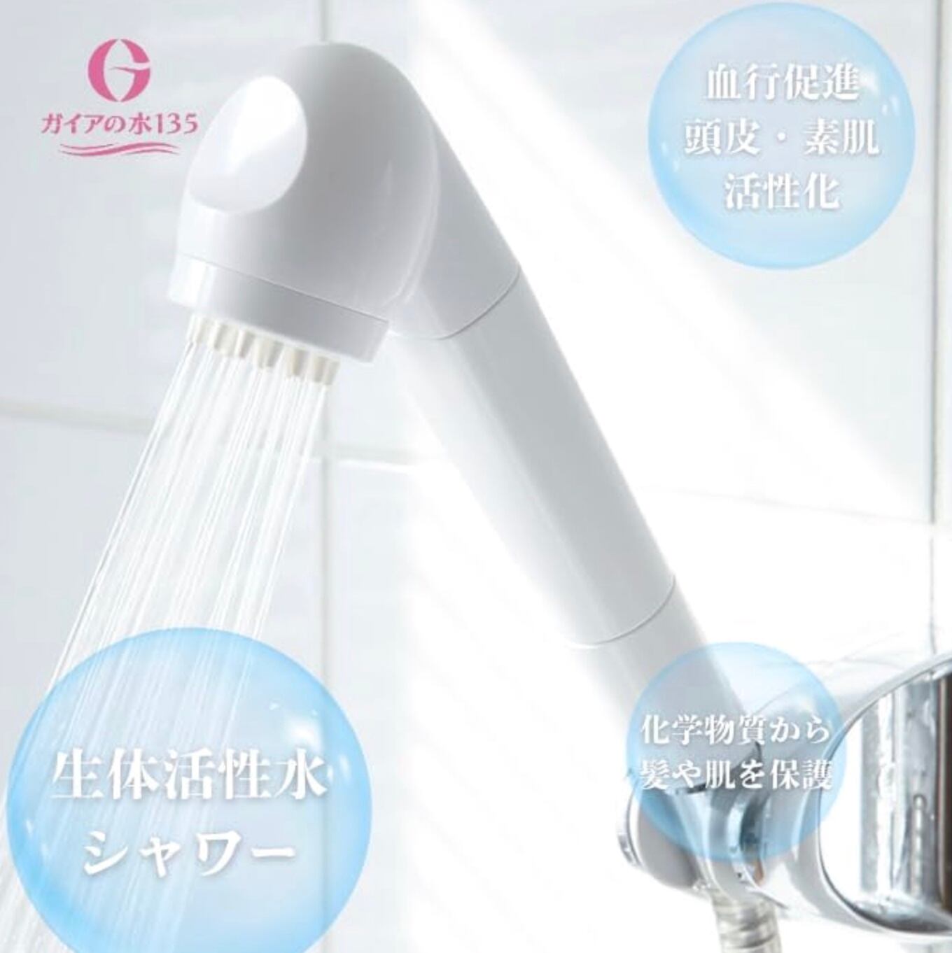 「ガイアの水135 シャワーヘッド」は「塩素」などを水道水から取り除き、髪や肌を守ります。